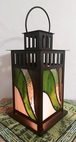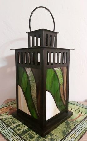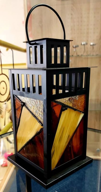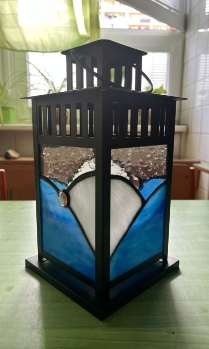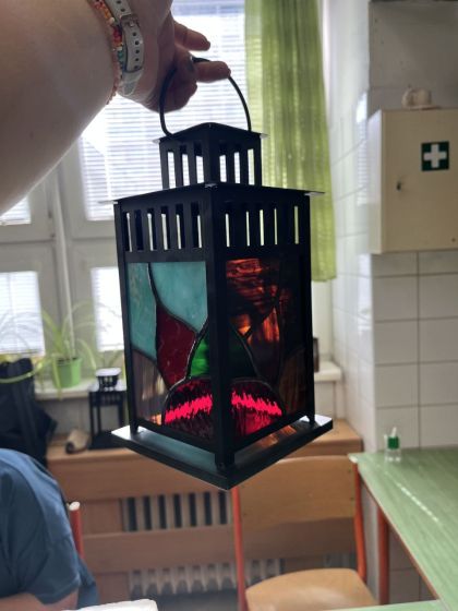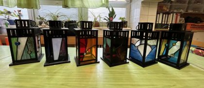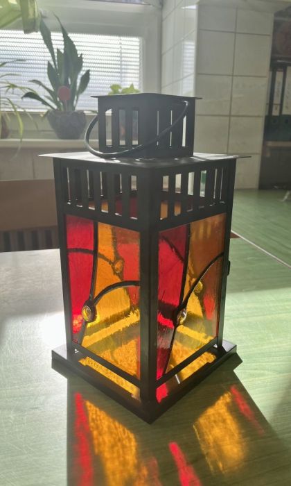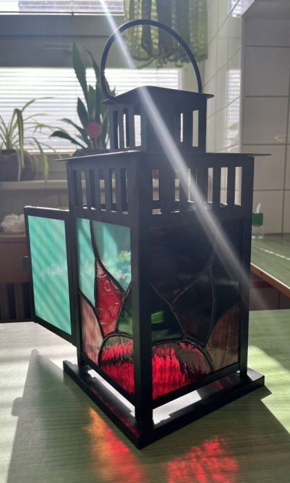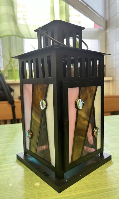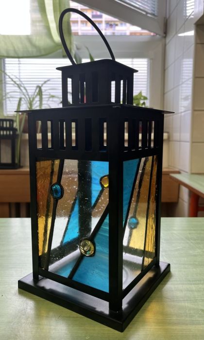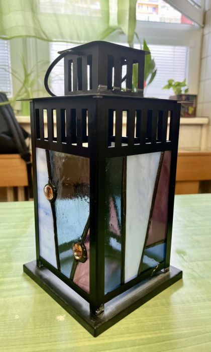 • V rámci kurzu si dle vlastního návrhu vyrobíme barevné skleněné výplně do lucerny (výška 28 cm) na svíčku z barevných vitrážových skel technikou tiffany.